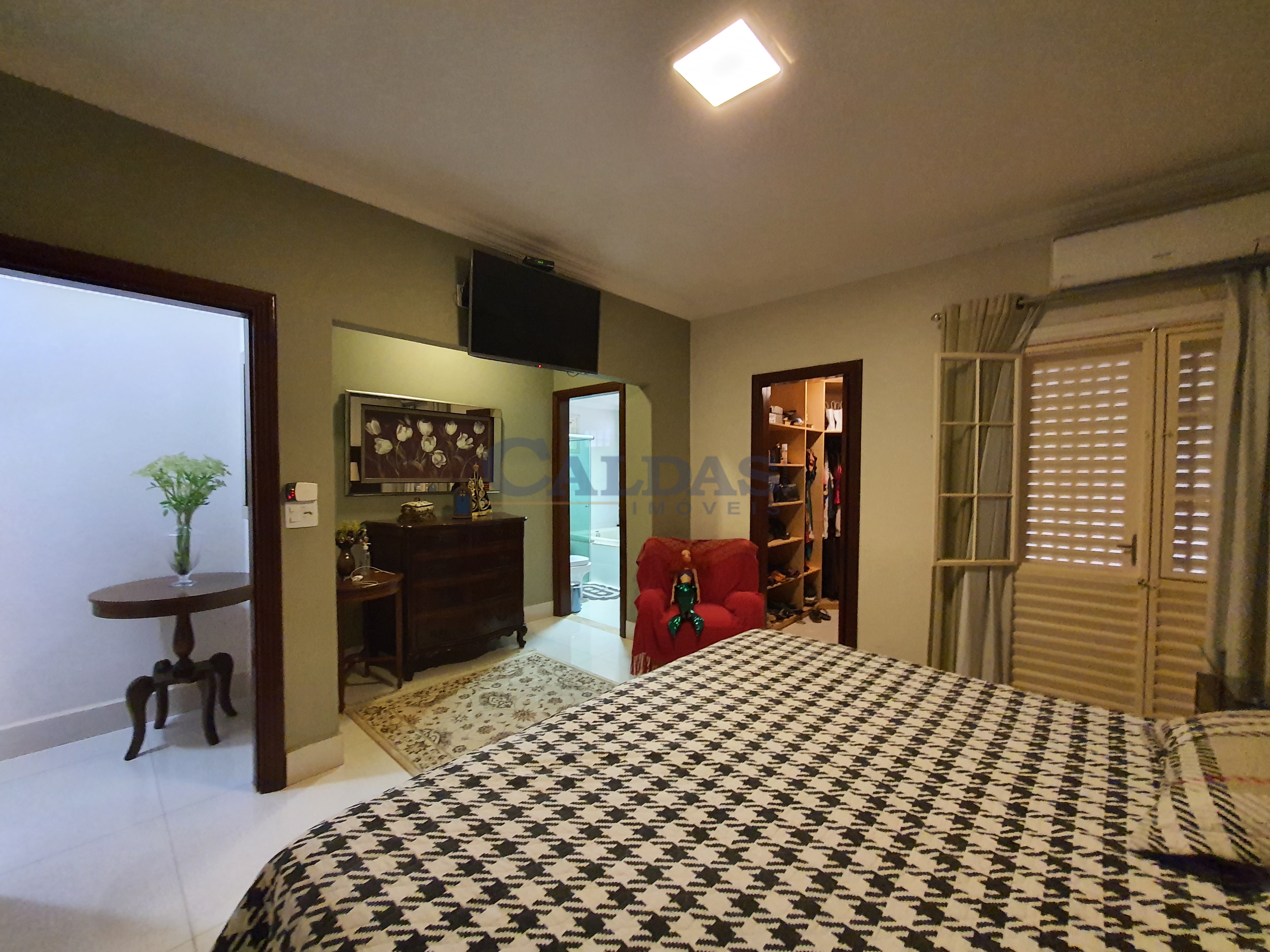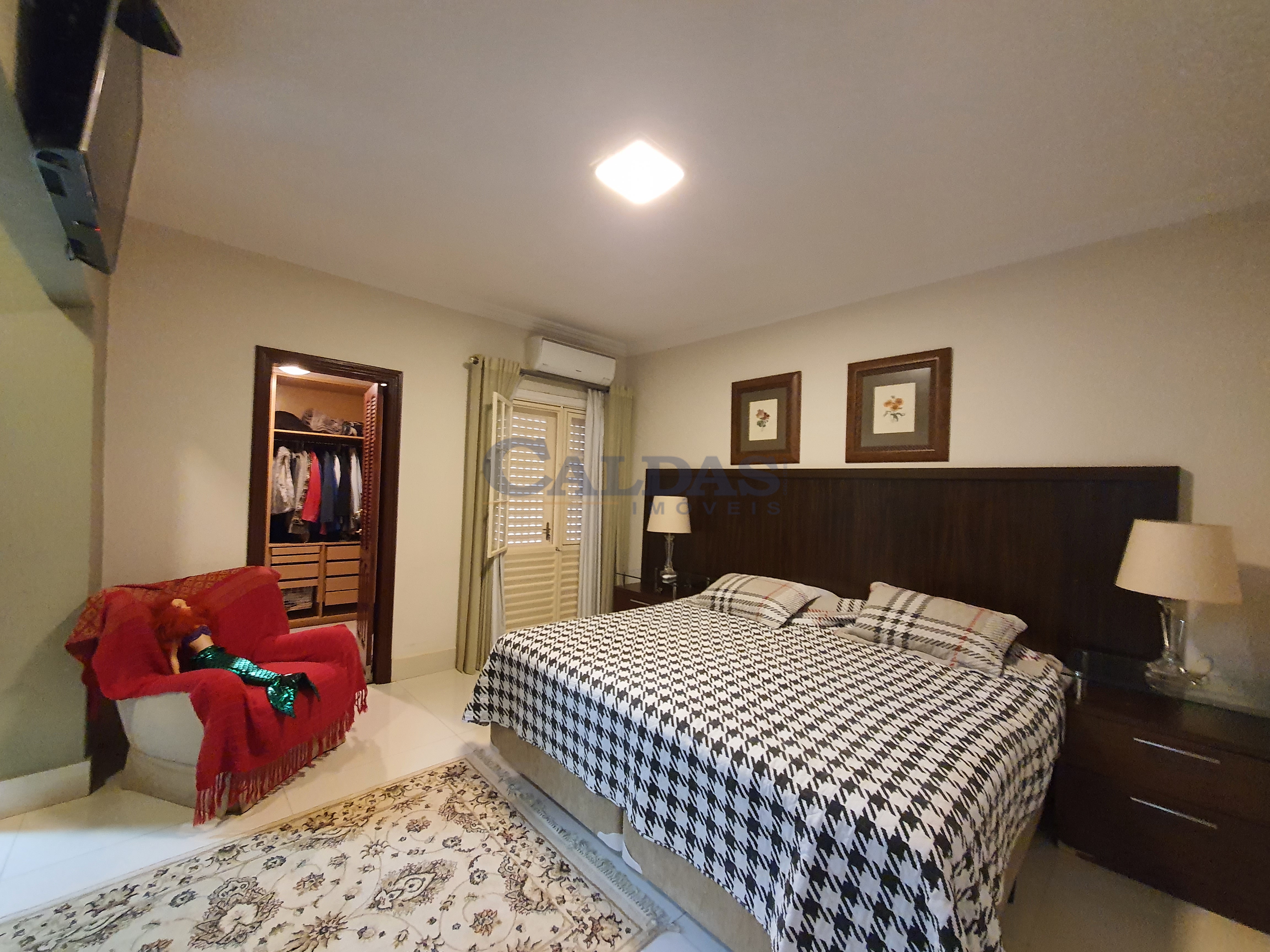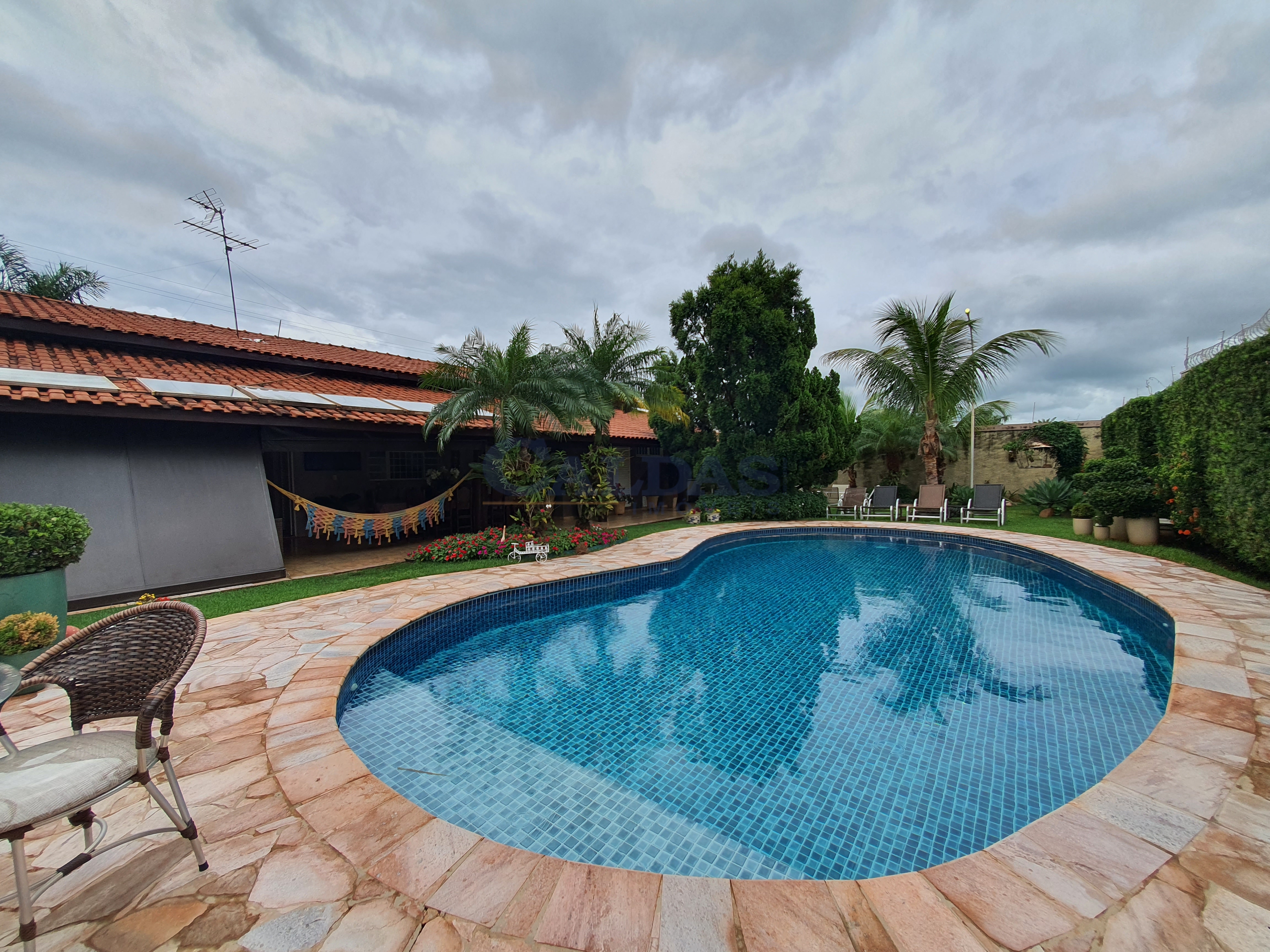 DESCRIÇÃO: 05 dormitórios sendo 02 suítes e 01 suíte máster (closet, banheira de hidromassagem), hall de entrada, sala ampla para 02 ambientes, lavabo, sala de TV, escritório, cozinha planejada, despensa, banheiro social, ampla área de lazer, piscina, chuveirão, quiosque, pia, balcão, churrasqueira, banheiro externo, lavanderia privativa, garagem para 06 veículos, casa externa para empregado (01 quarto, cozinha, banheiro), jardins, sistema de segurança, portão eletrônico, interfone, sistema solar e diversos planejados.