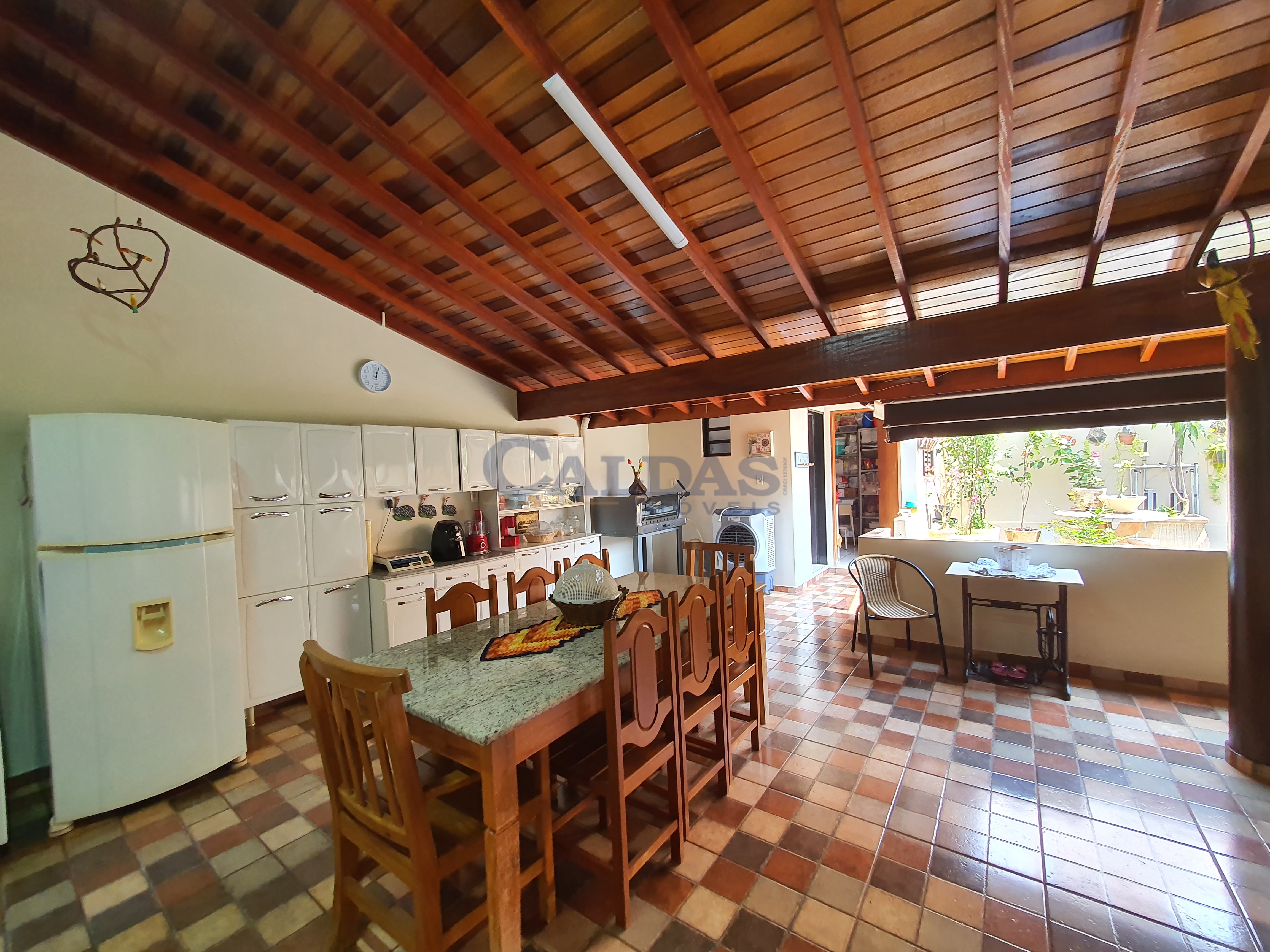 fogão a lenha, forno, cozinha externa, lavanderia, banheiro externo, garagem coberta, teto laje e piso cerâmica.